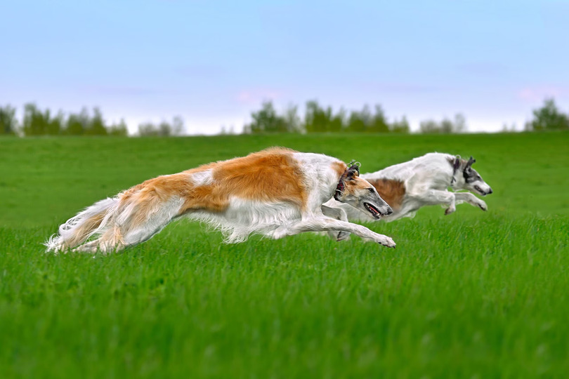 Having originated in Russia, Borzois were traditionally bred to hunt. They come with a lean frame, long legs and powerful hindquarters that help them sprint and cover long distances quickly. Despite having natural hunting instincts, the dogs are calm and have a gentle temperament, making them excellent pet dogs.