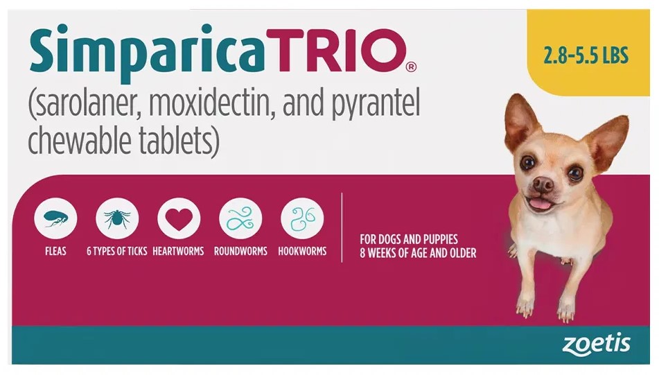 Simparica TRIO is a powerful treatment that provides comprehensive protection in a single dose for a complete month. It protects from fleas, ticks (Black-legged tick, Brown dog tick, American dog tick, Gulf coast tick, Lone star tick and Asian longhorned tick), roundworms, hookworms, heartworm disease and Lyme disease. Additionally, it is available in a pork-liver flavored chewable form, making it easy to administer to dogs and puppies 8 weeks of age and older, weighing 2.8 lbs or greater.